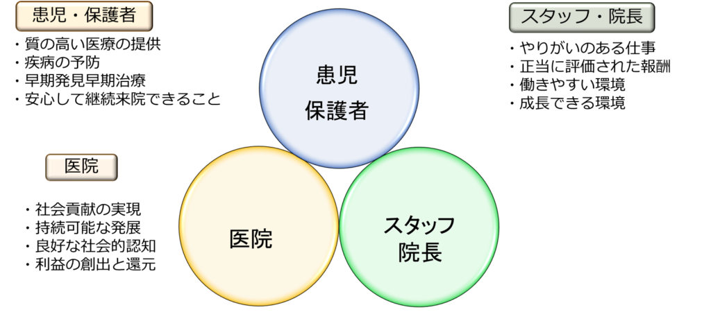 小児歯科診療を『患児・保護者』・『スタッフ・院長』・『医院』の3方がall-winとなるように提供すること